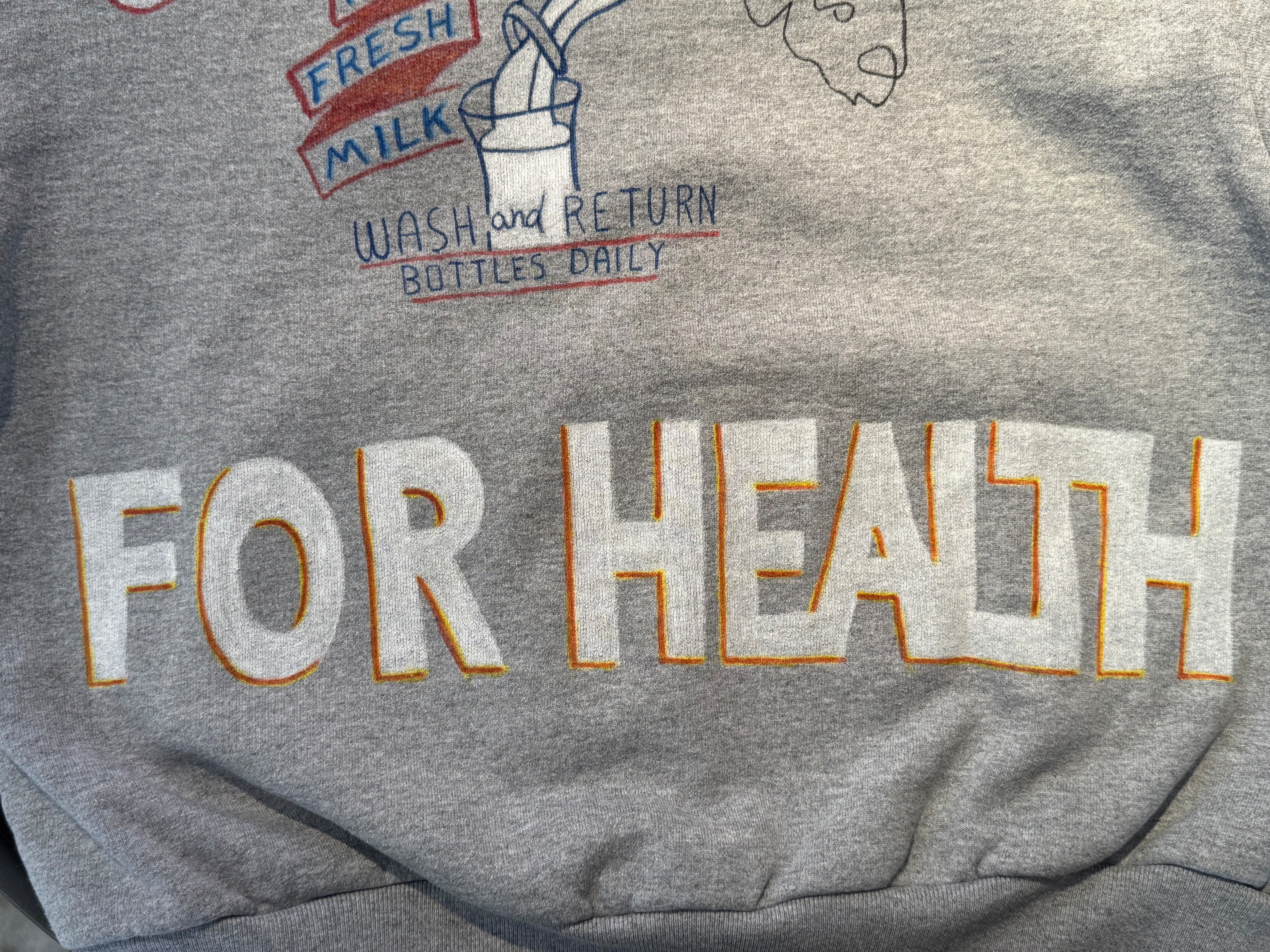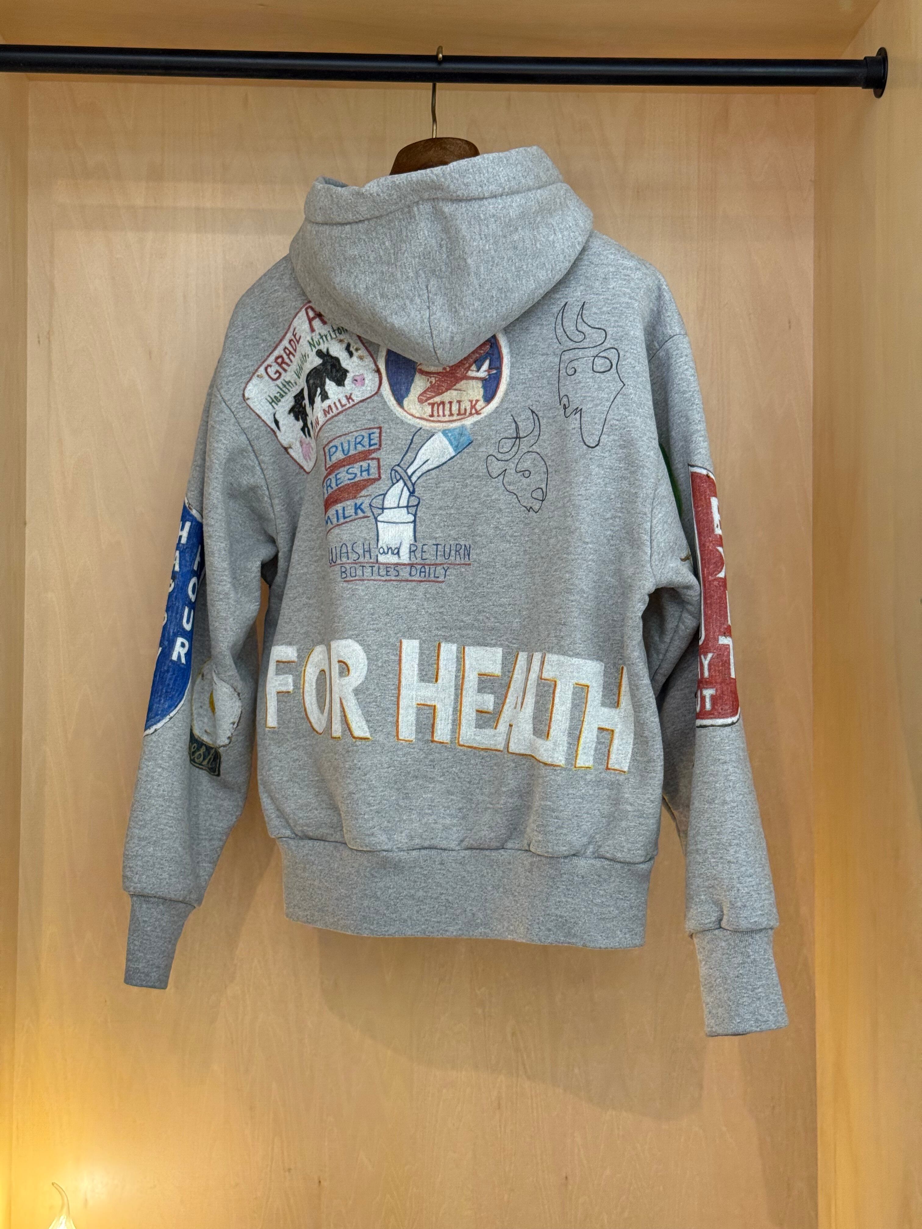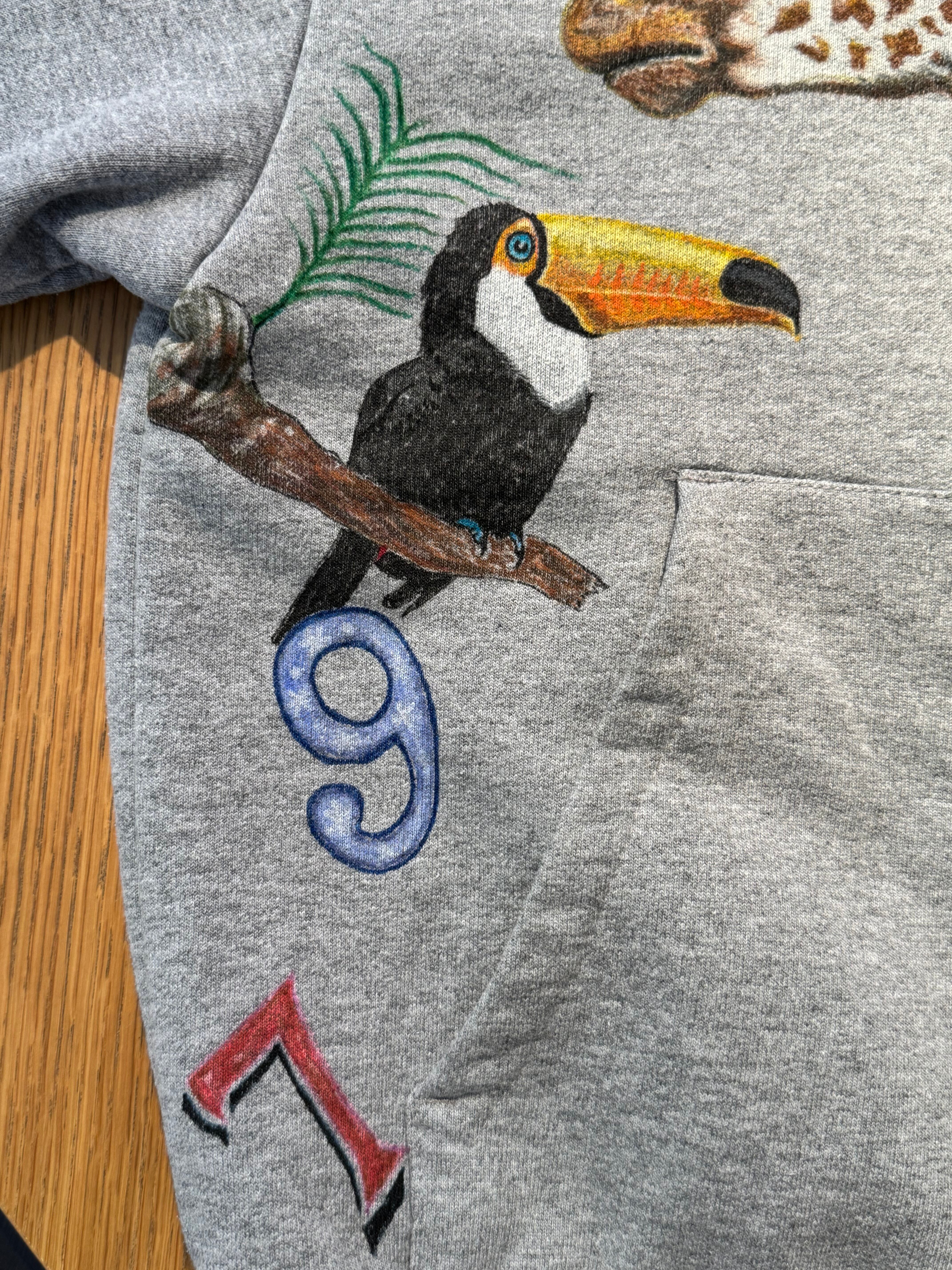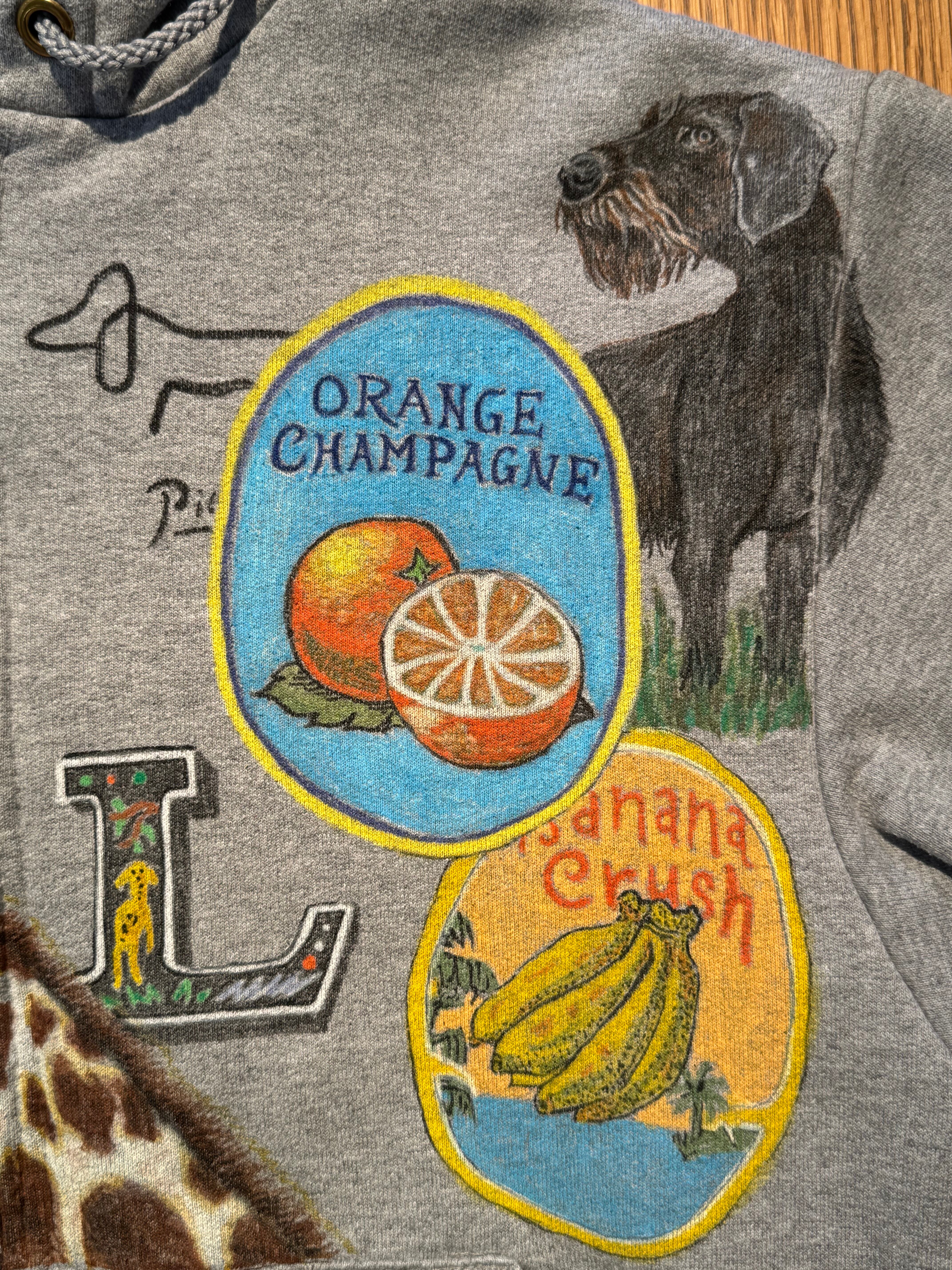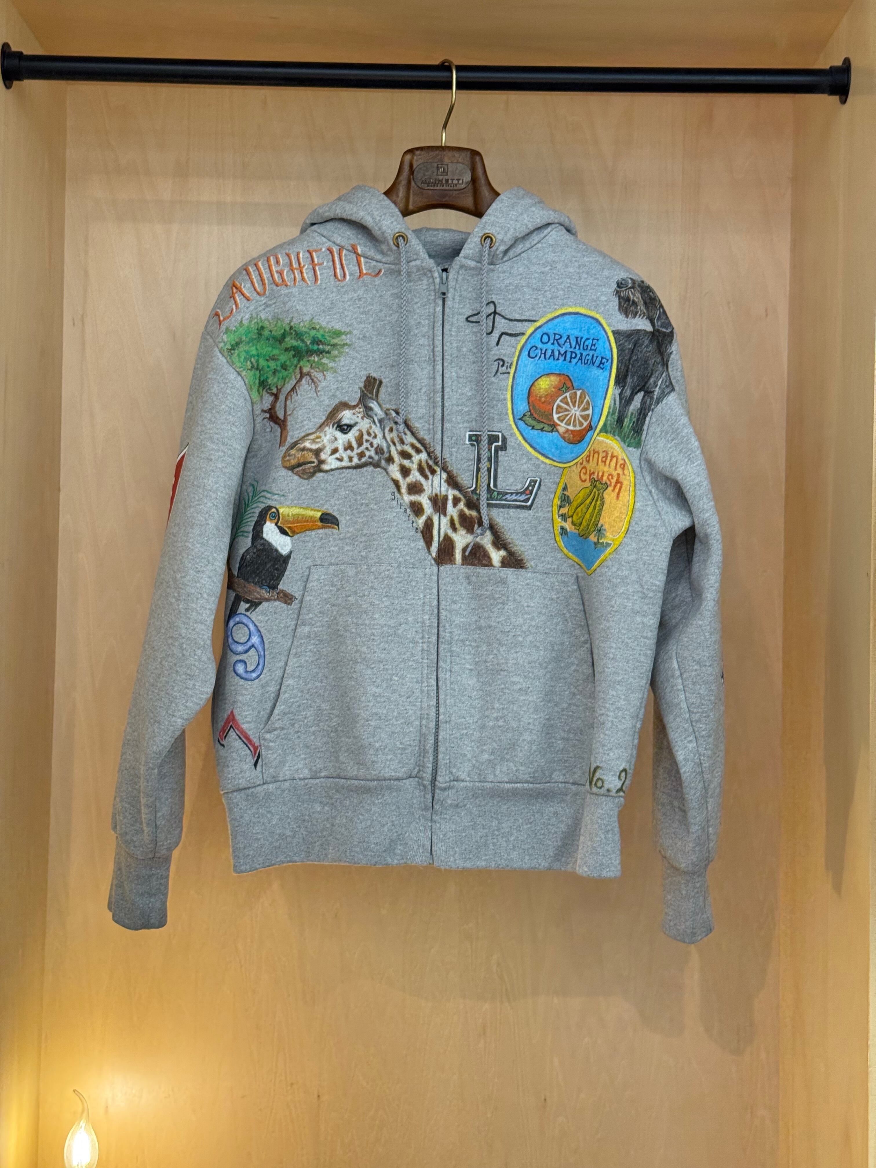 このパーカーは、そんな“気分を高めてくれるモノ”たち――動物、植物、記憶の断片、果物、どこかで見かけたモチーフ――を一つひとつ丁寧に描き込んだ、手描きの一点ものです。