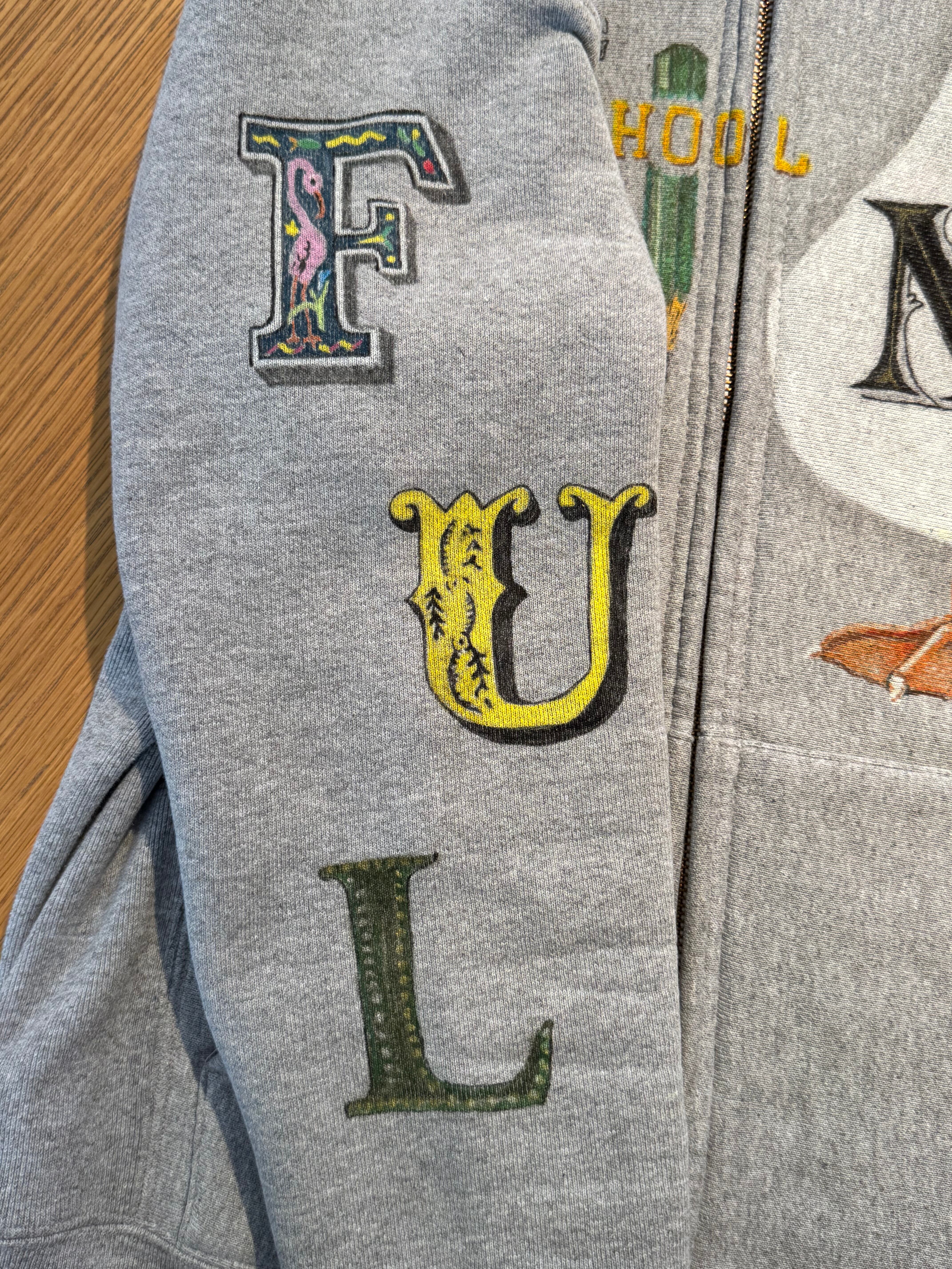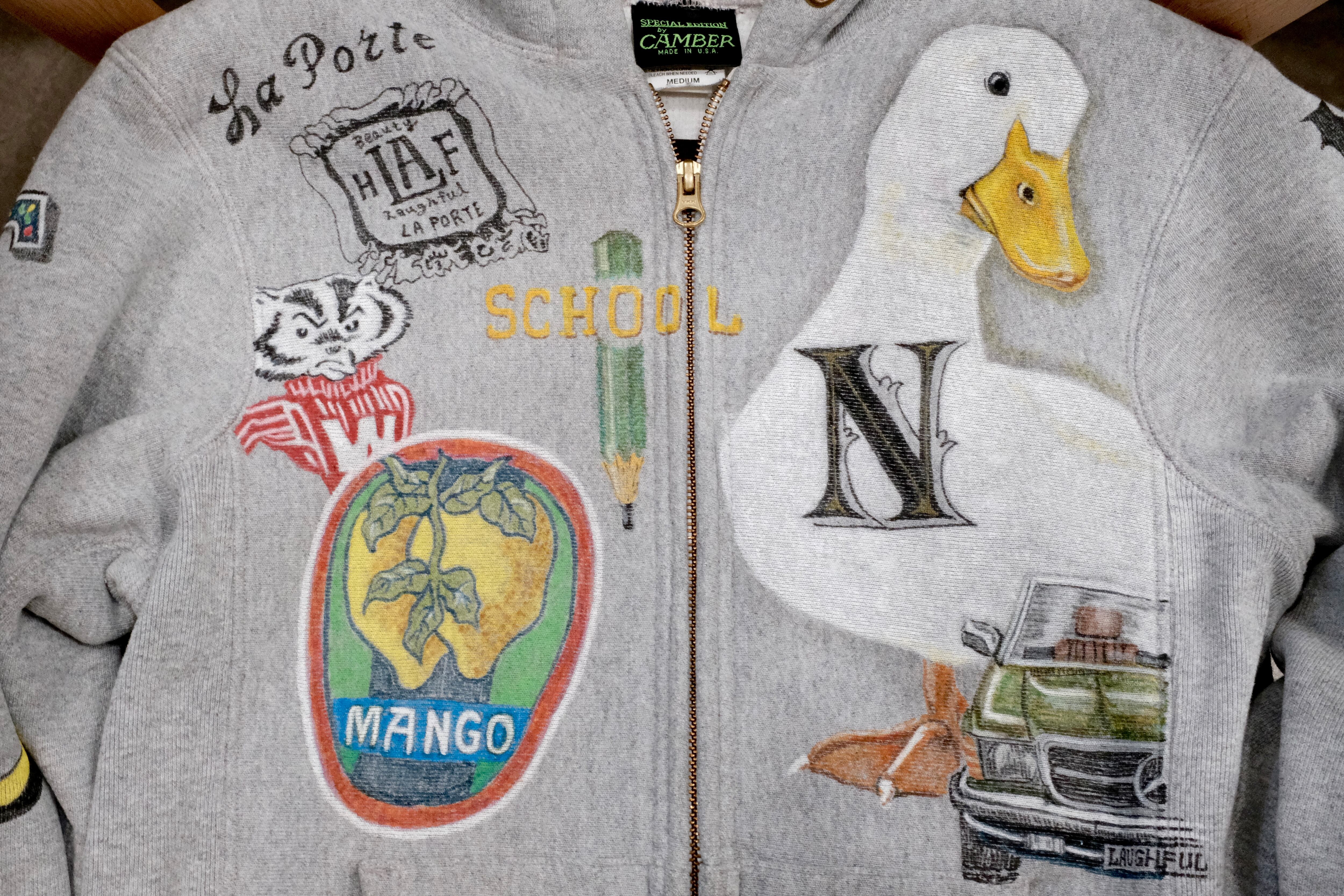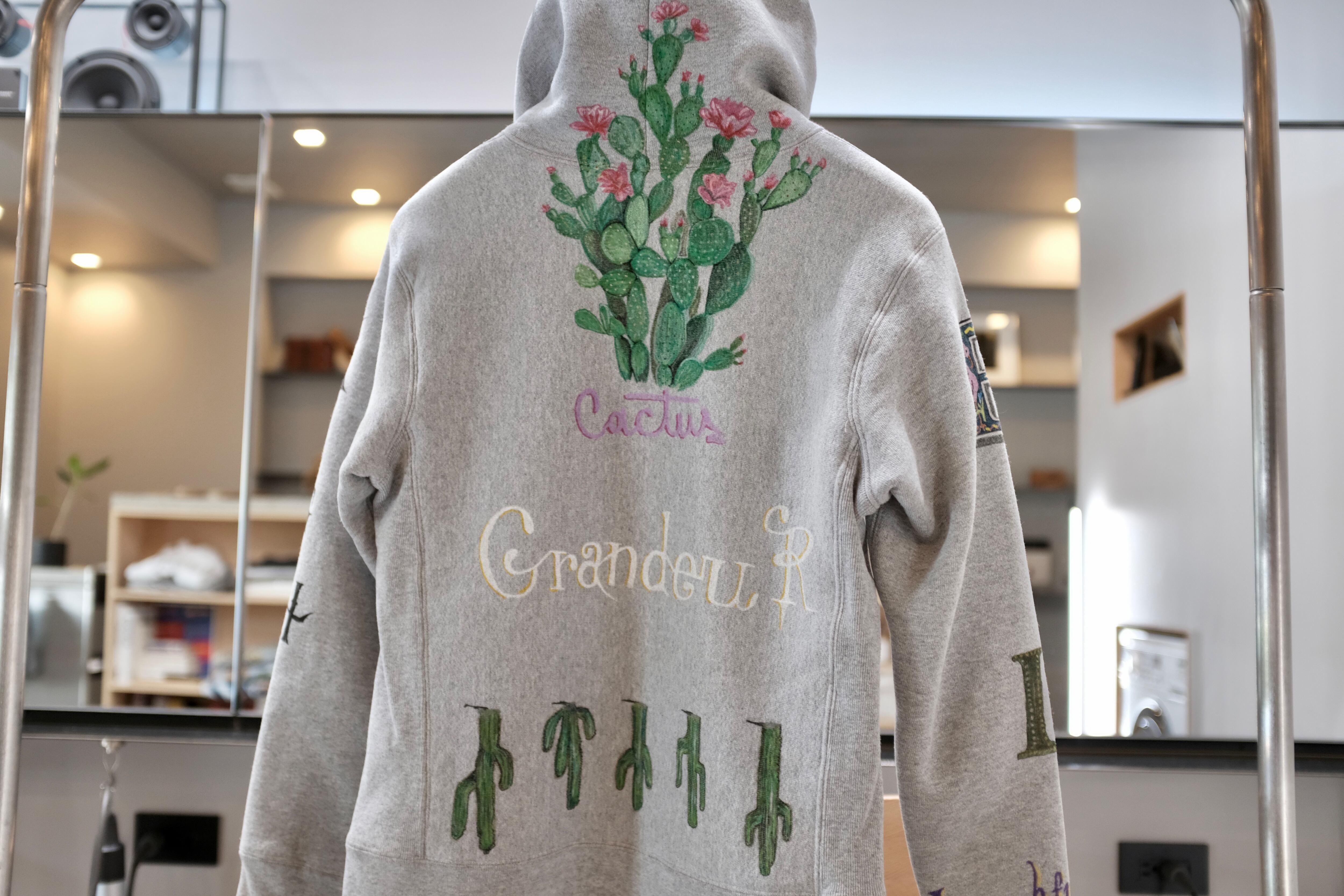 このパーカーは、そんな“気分を高めてくれるモノ”たち――動物、植物、記憶の断片、果物、どこかで見かけたモチーフ――を一つひとつ丁寧に描き込んだ、手描きの一点ものです。