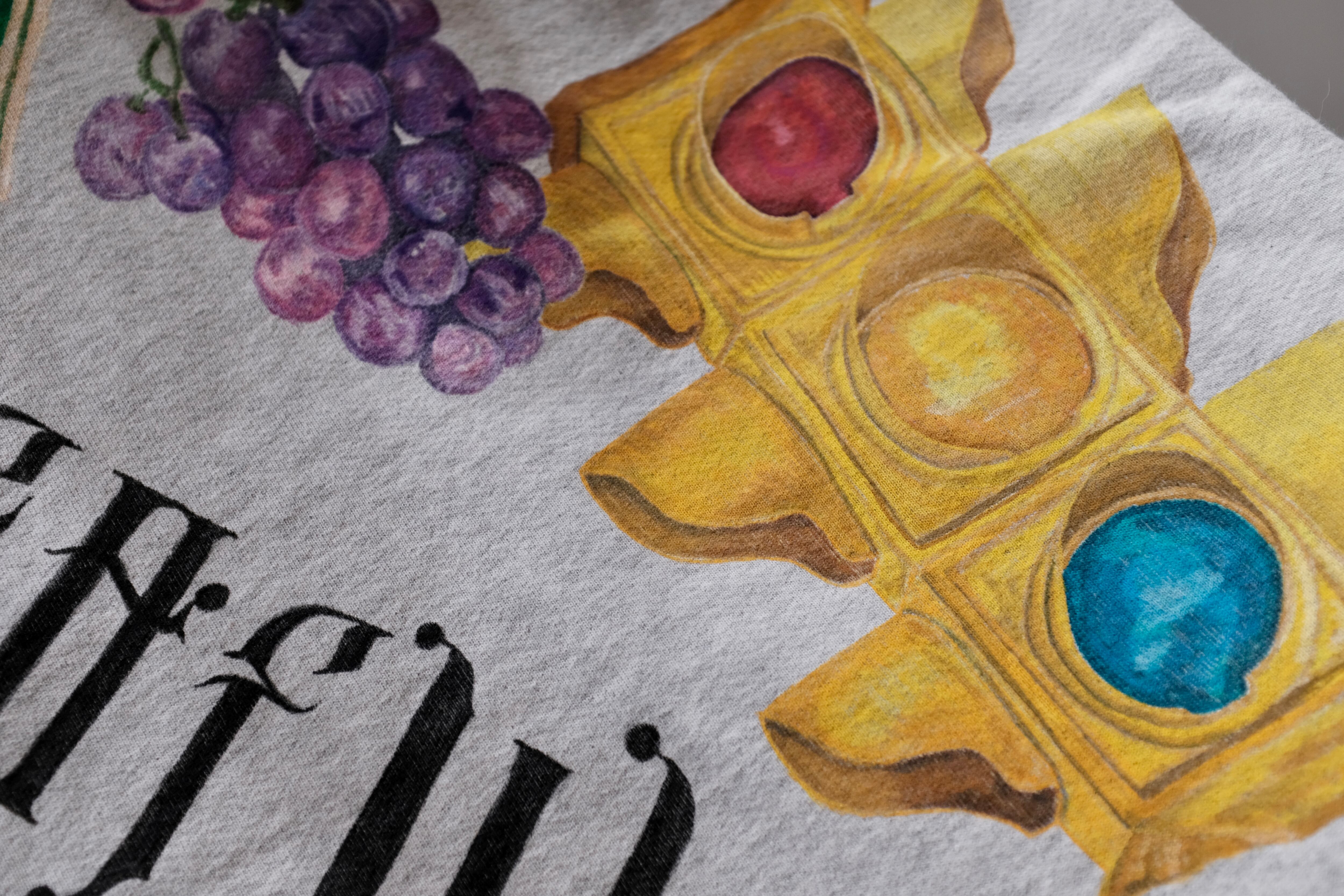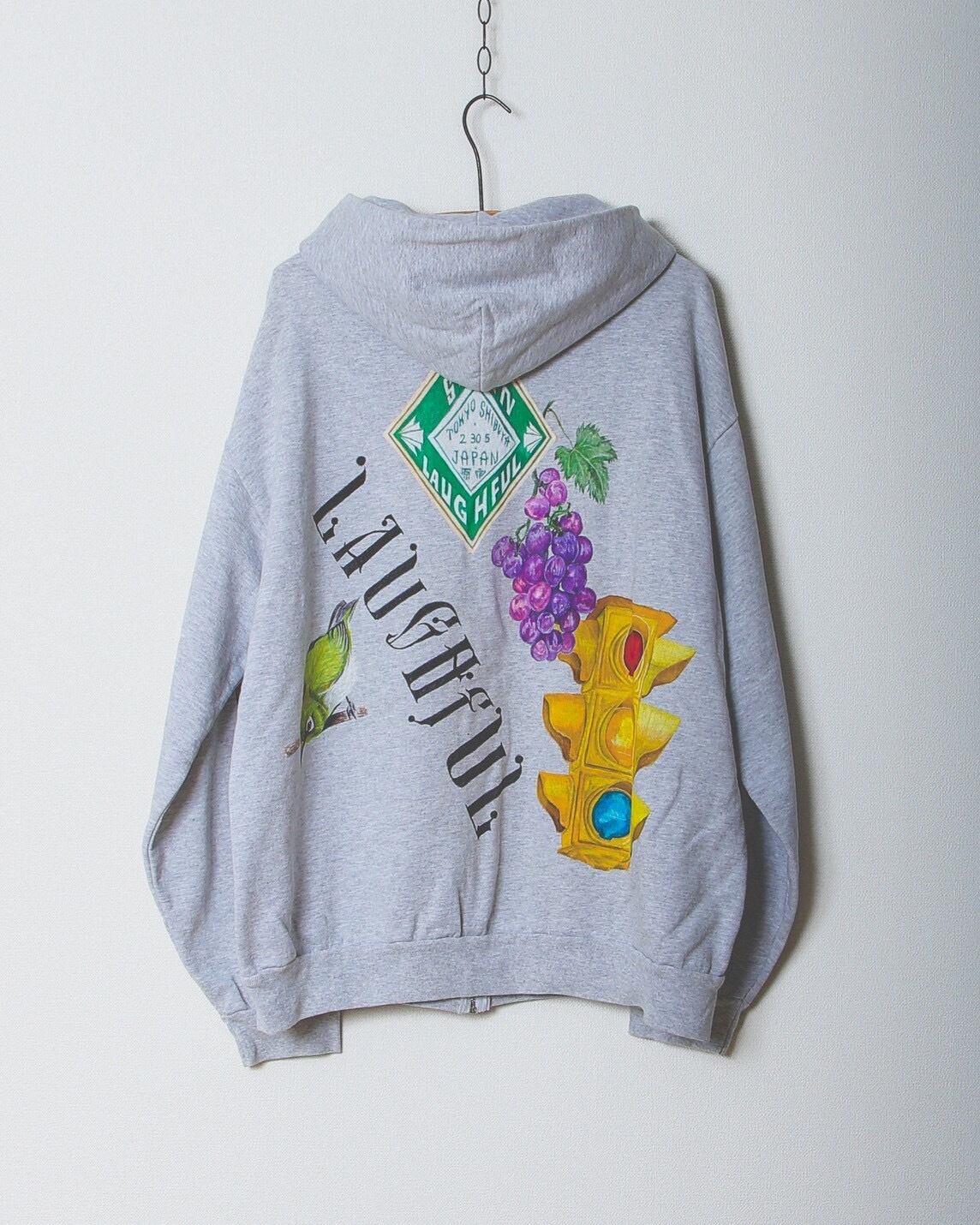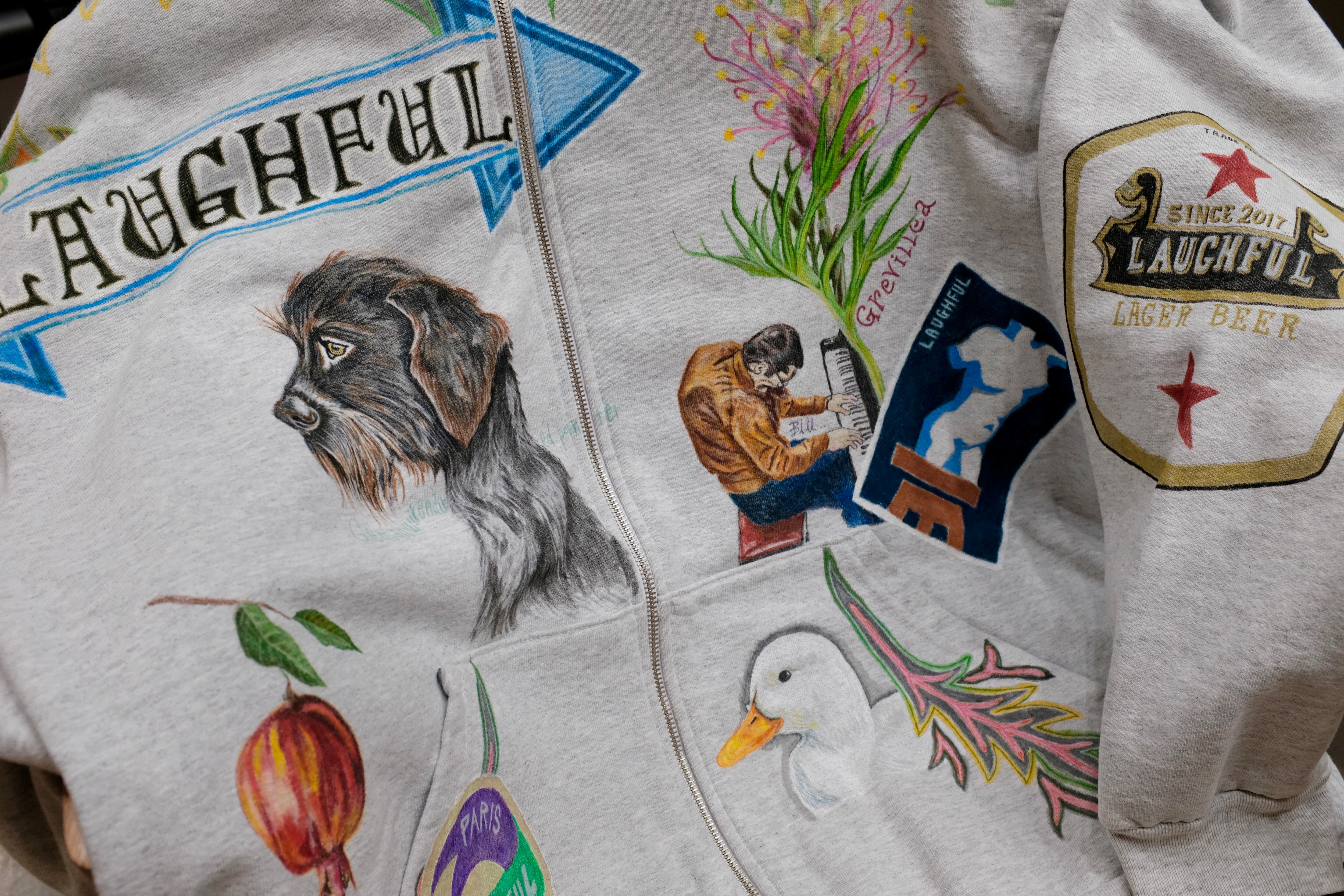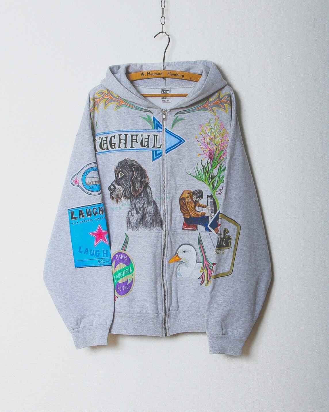 このパーカーは、そんな“気分を高めてくれるモノ”たち――動物、植物、記憶の断片、果物、どこかで見かけたモチーフ――を一つひとつ丁寧に描き込んだ、手描きの一点ものです。